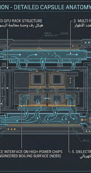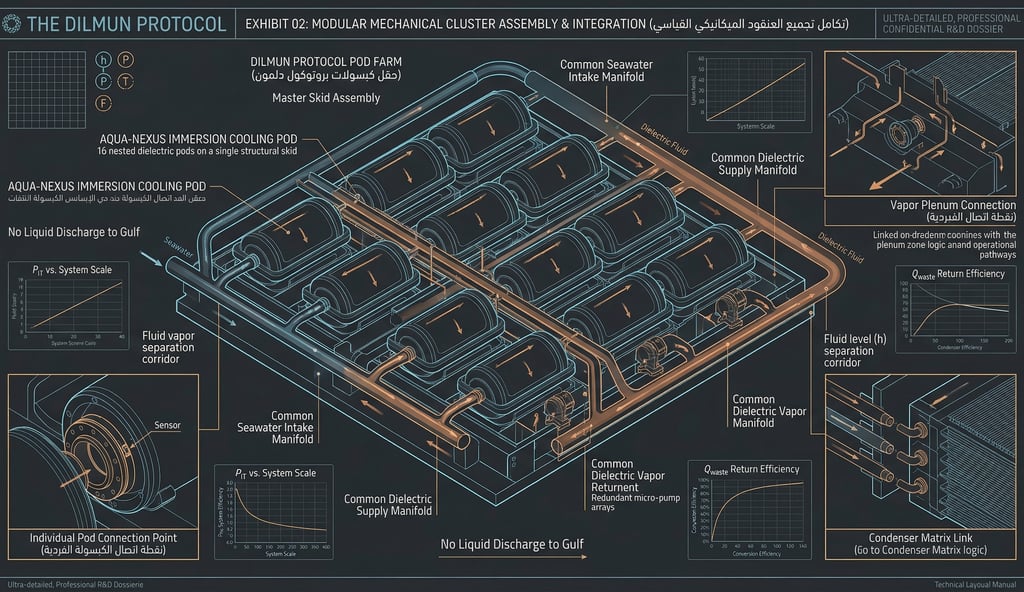 The mechanical backbone of the infrastructure. This blueprint exposes the modular assembly of 16 high-capacity dielectric immersion pods. It highlights the multi-stage micro-pump logic, centralized fluid manifolds, and the robust structural skid engineering designed for rapid, scalable deployment.