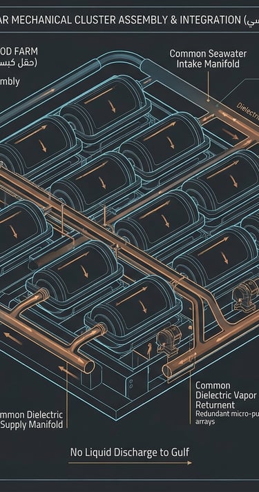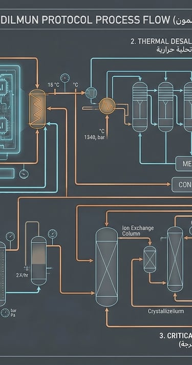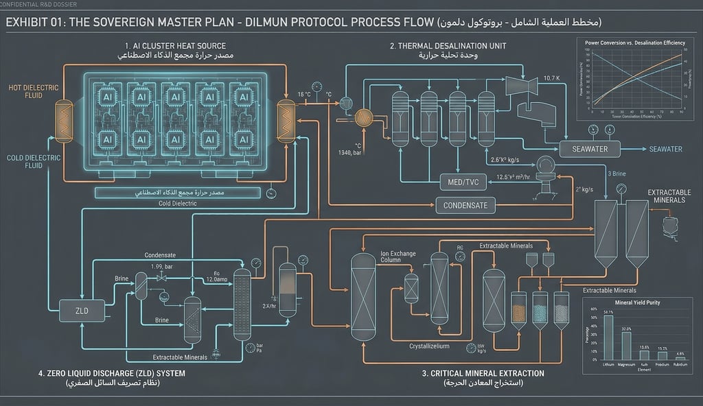 Comprehensive macro-architecture of the Dilmun Protocol. This schematic details the closed-loop thermodynamic cycle, illustrating the seamless integration between high-density AI immersion clusters, multi-stage thermal desalination, and mineral extraction units. Designed for continuous water-positive operation and Zero Liquid Discharge (ZLD).