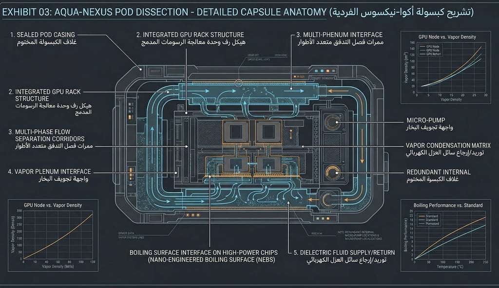 A deep-dive cross-section into the core cooling unit. This schematic reveals the internal two-phase dielectric fluid dynamics, vapor phase separation corridors, and the integrated heat exchanger matrix. Engineered to sustain next-generation GPU hardware with maximum thermal efficiency.